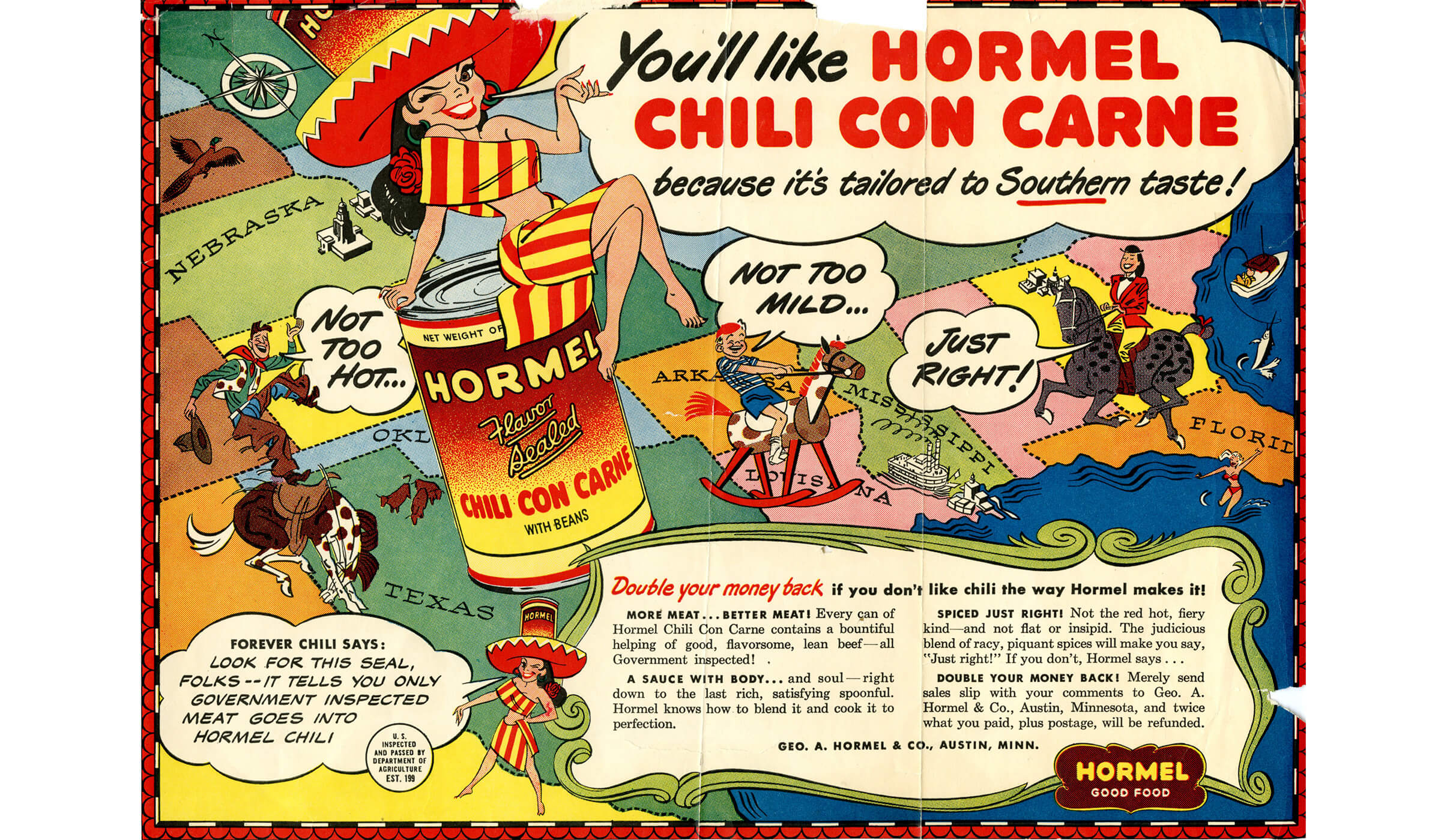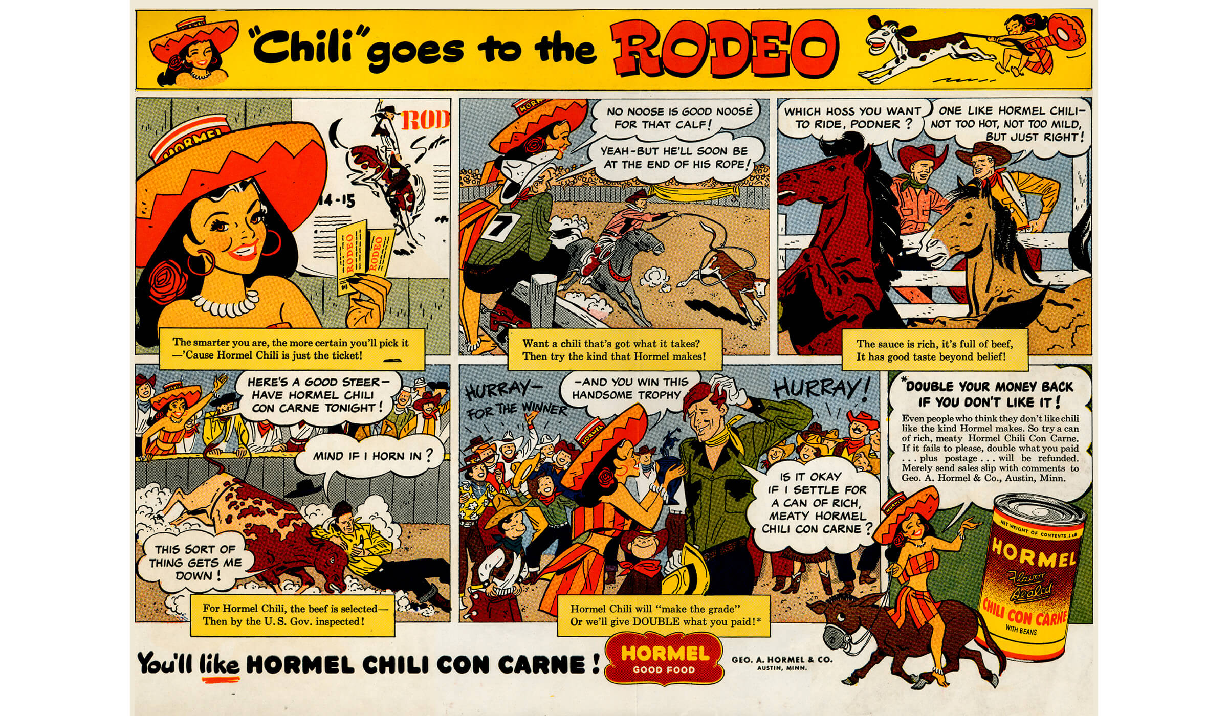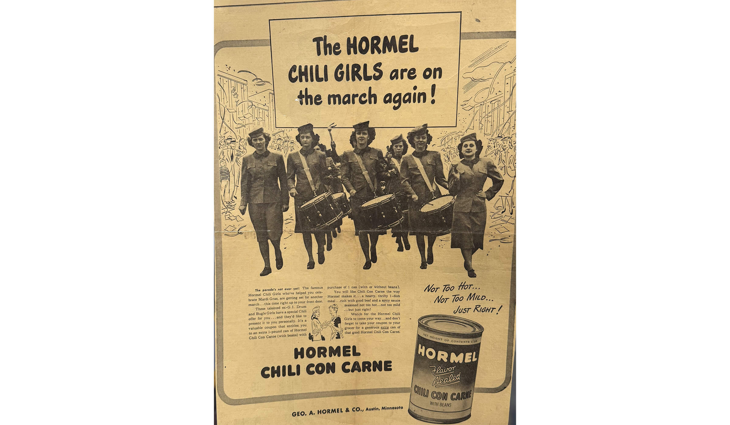 In 1940, Hormel teamed up with comedy duo George Burns and Gracie Allen to highlight the growing popularity of Chili Con Carne. The following year, as the U.S. entered World War II after the attack on Pearl Harbor, commercial artist George Switzer redesigned the product’s packaging to make the brand instantly recognizable on store shelves. However, by late 1941, tin became scarce due to the war effort, forcing the company to temporarily discontinue its canned products. In 1944, as tin supplies improved, a bold ad on the back of TIME Magazine triumphantly declared “It’s Back!” when limited quantities of Chili Con Carne returned to market. In 1945, Jay Hormel introduced the “Hormel Girls,” a musical troupe organized to promote Chili Con Carne directly to housewives, the brand’s primary target shoppers at the time. By 1948, Hormel debuted the cartoon mascot “Forever Chili” in comic strips, promoting the product with the line “Not too hot; not too mild—just right!” The Forever Chili character also appeared on billboards nationwide, a campaign that ran through 1952.