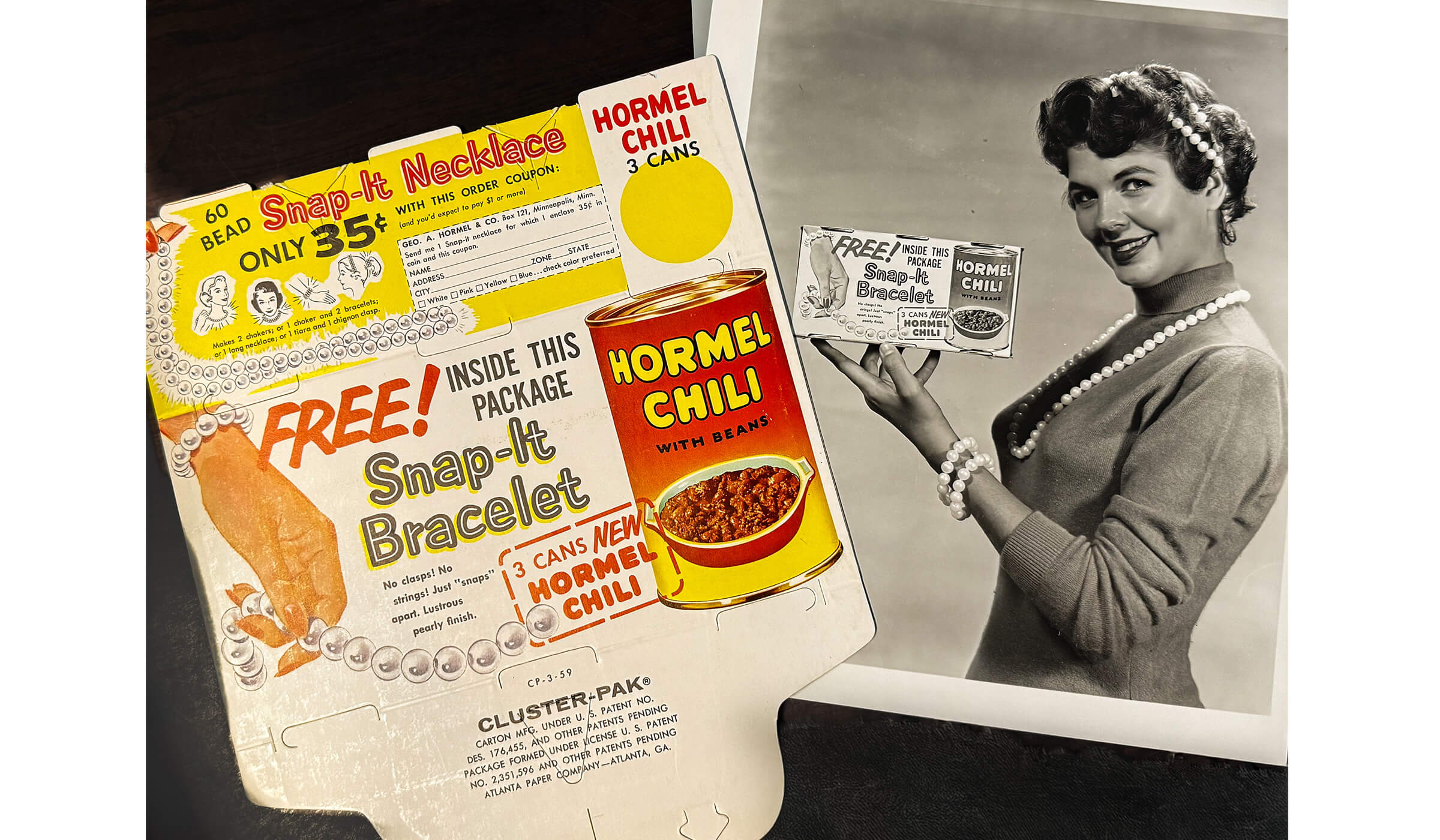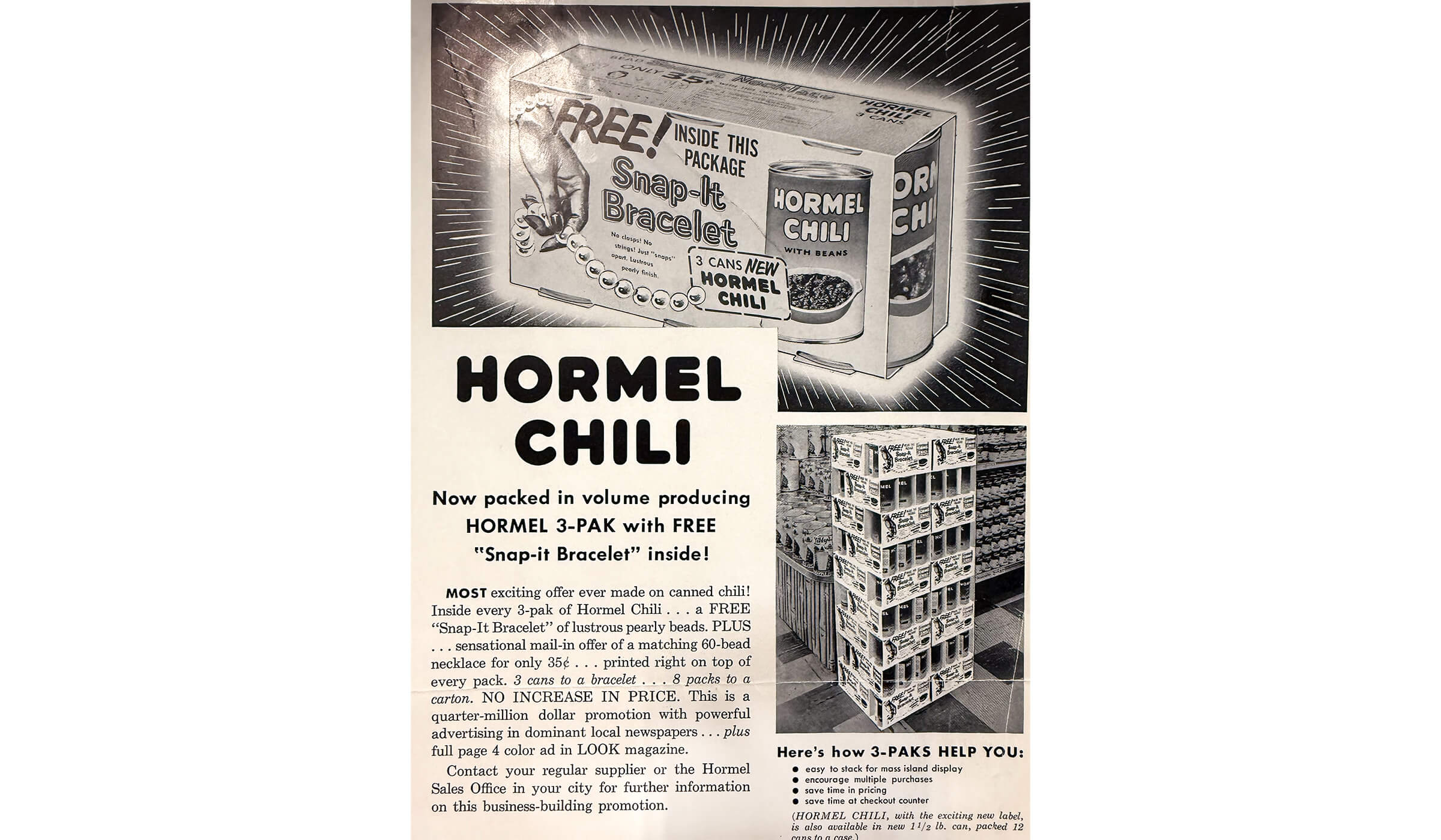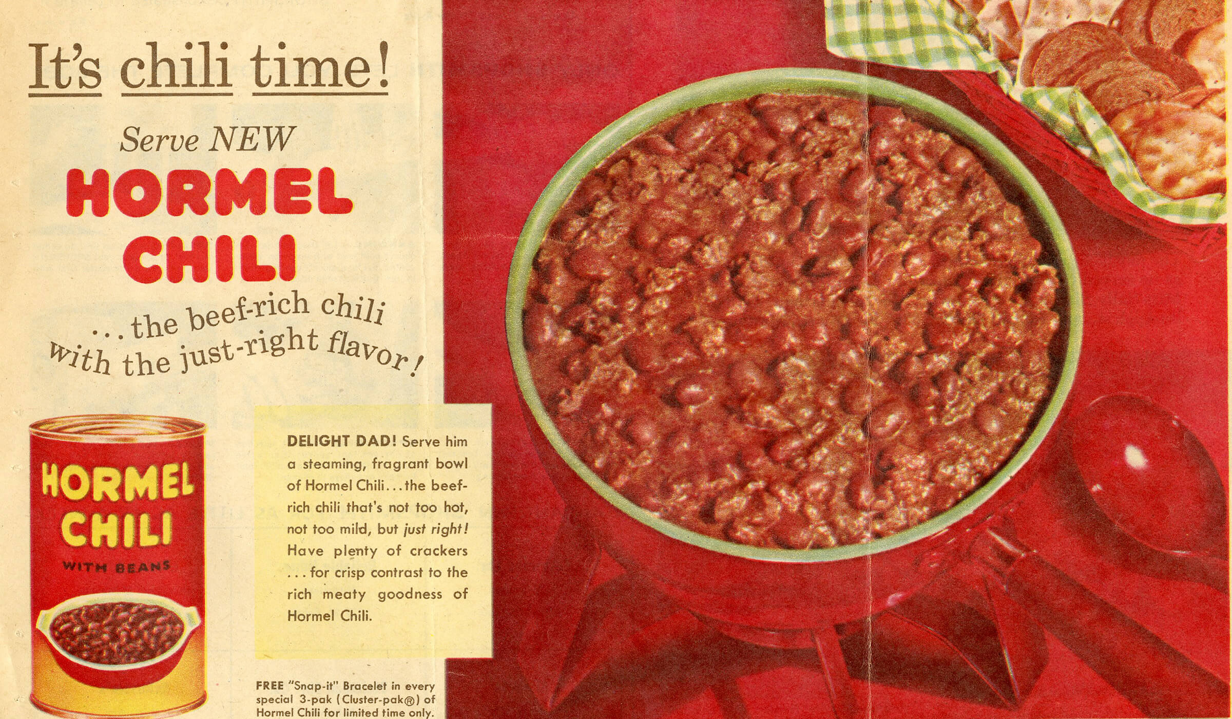 HORMEL® Chili began a promotion in the mid 1950s for free ‘Snap-It’ Bracelets inside packages of chili- a continued effort to target the housewife as the primary purchaser.