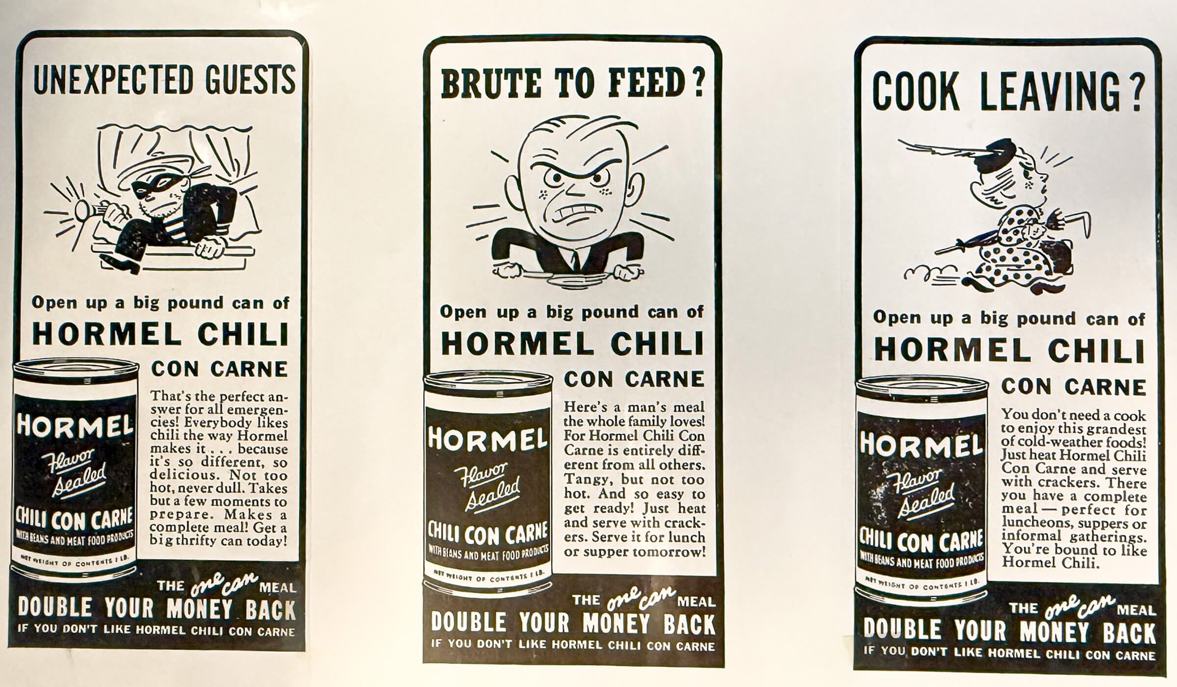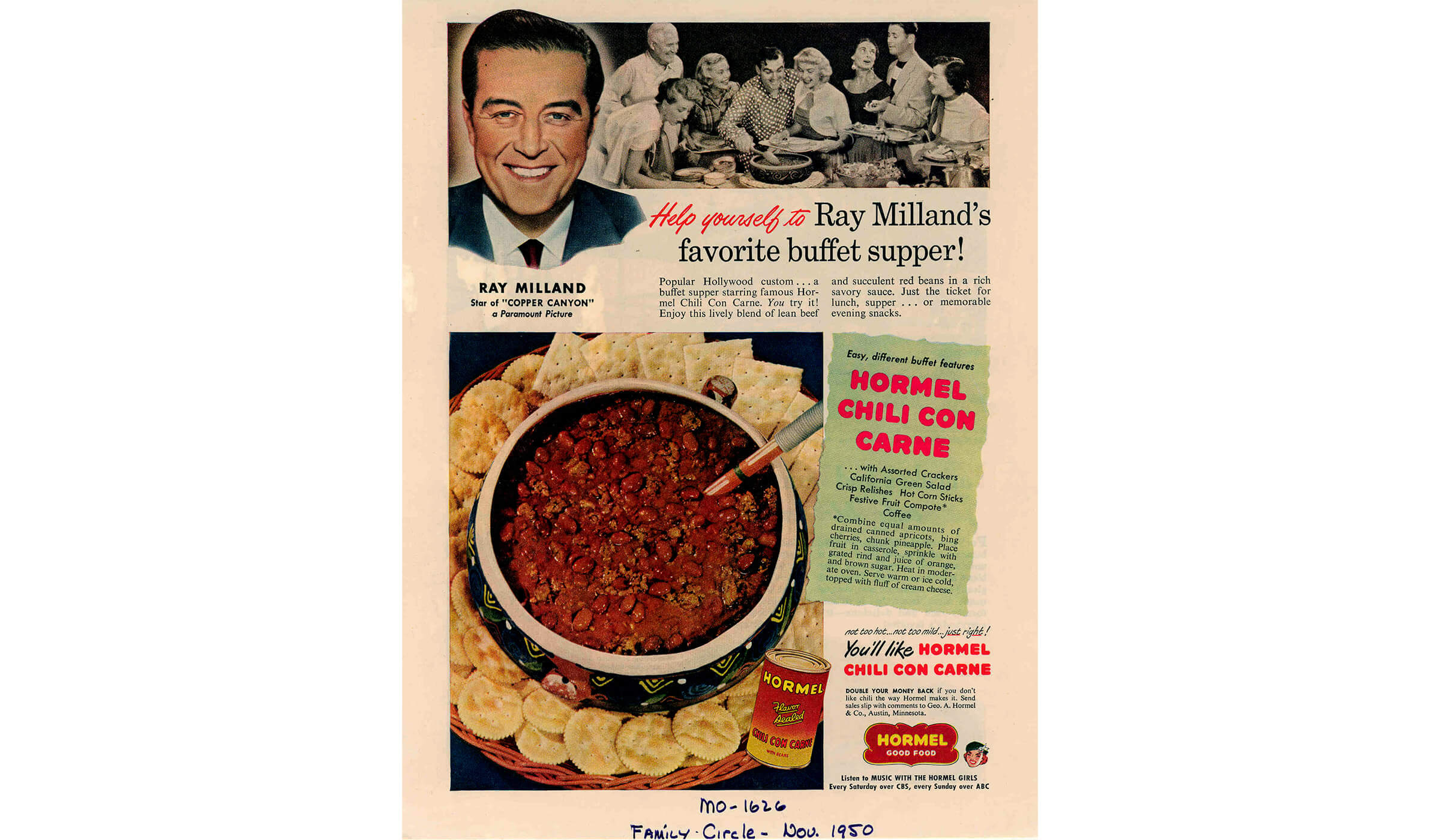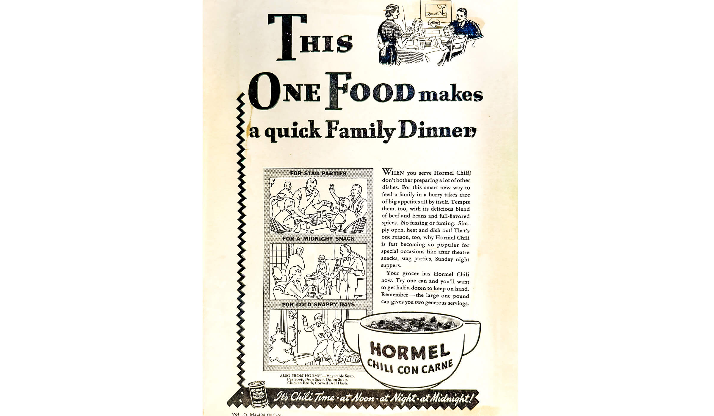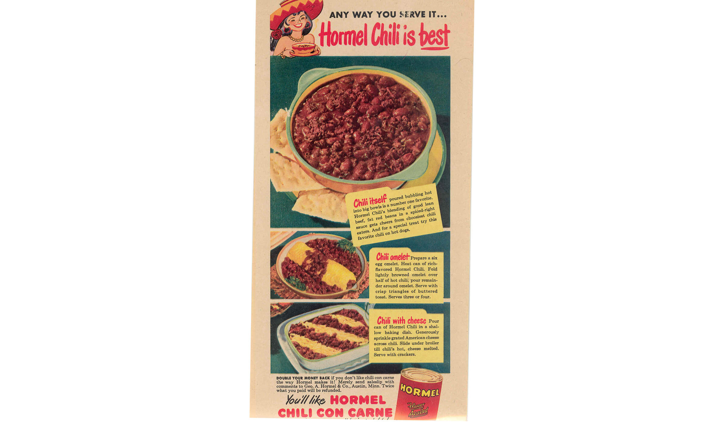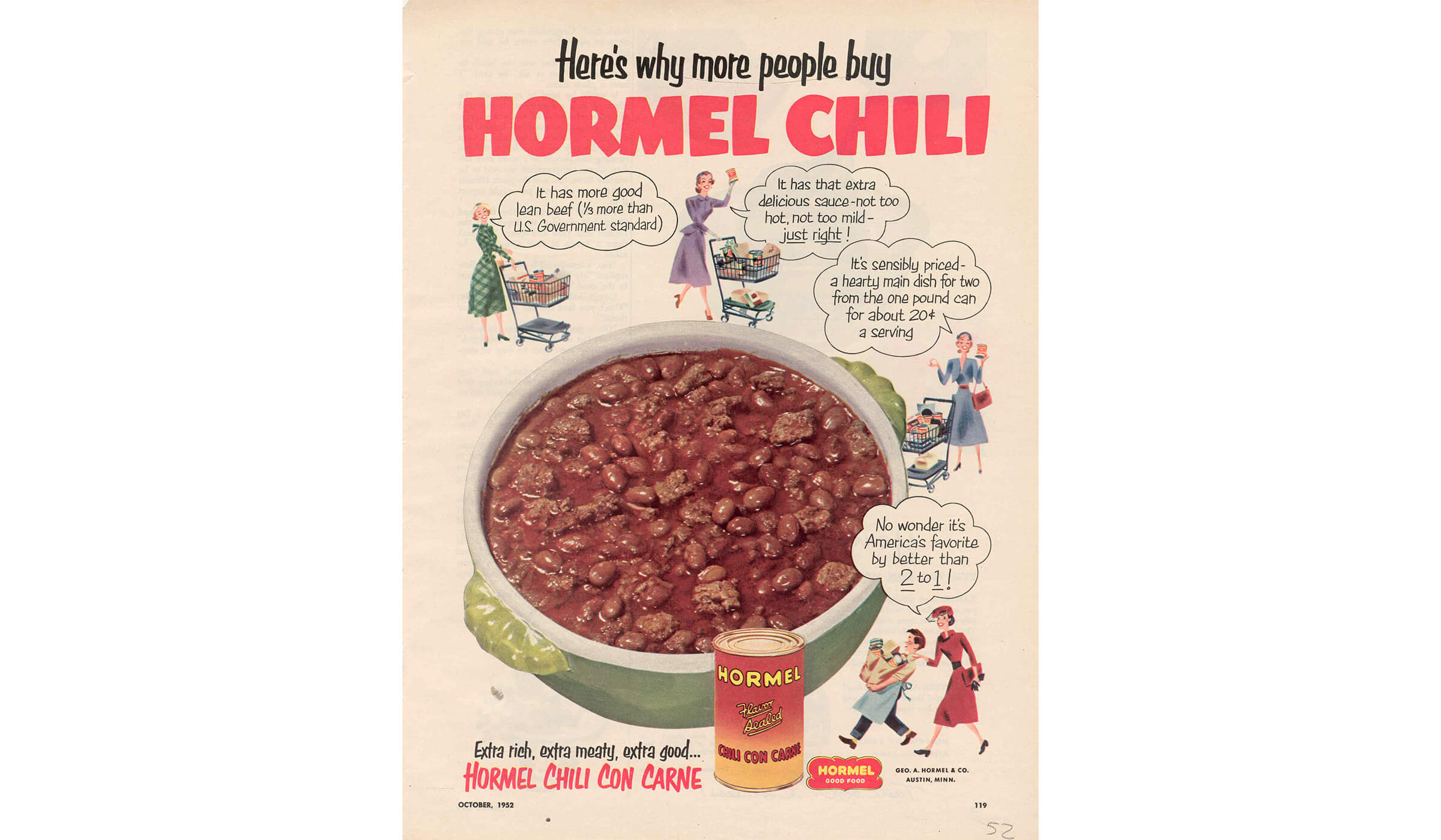 An ad from mid 1940s, targeting housewives as the main purchaser of HORMEL® Chili Con Carne