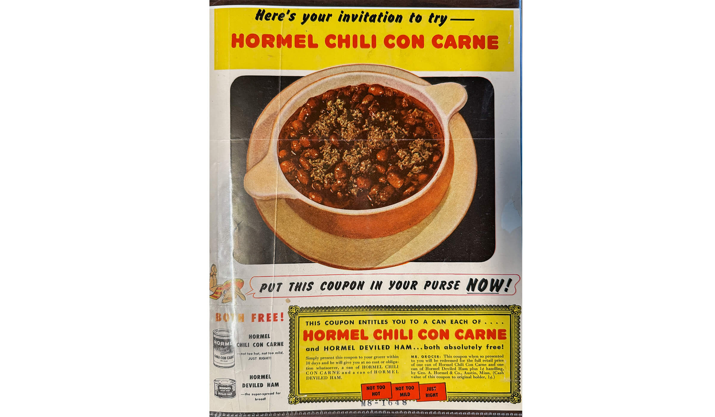 A magazine page ad from the mid 1940s featuring a coupon for free HORMEL® Chili Con Carne and HORMEL® Deviled Ham