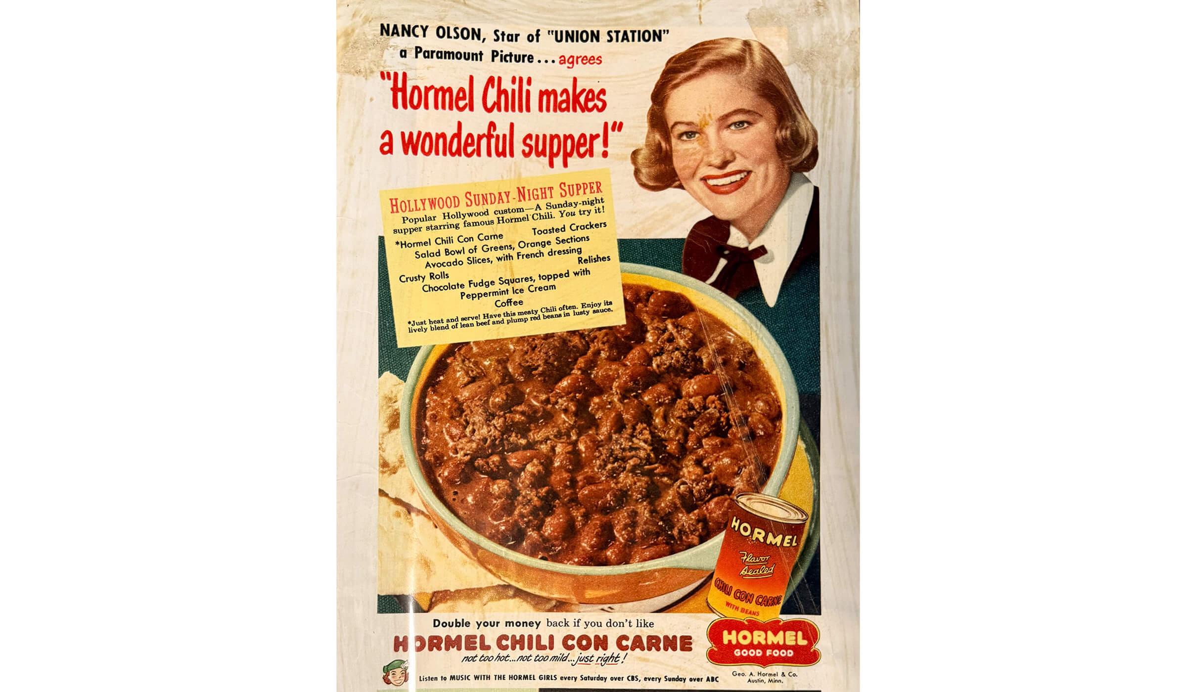 An early 1950’s ad featuring Nancy Olson, a celebrity and the continued use of the “Double your money back” slogan.