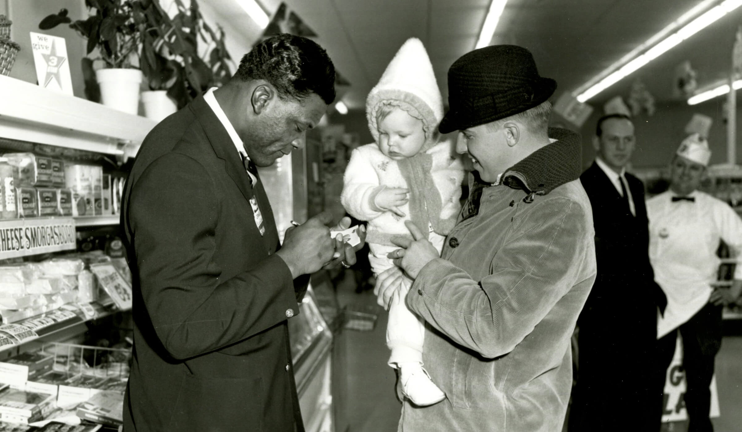 Carl Eller of the Minnesota Vikings signs autographs for a HORMEL® Chili promotion in store in 1965