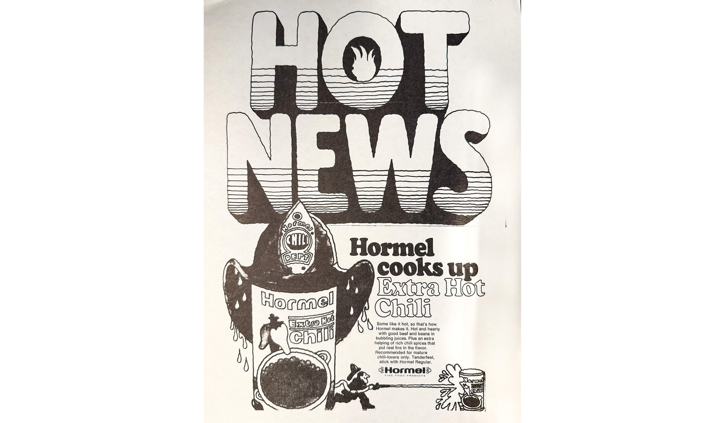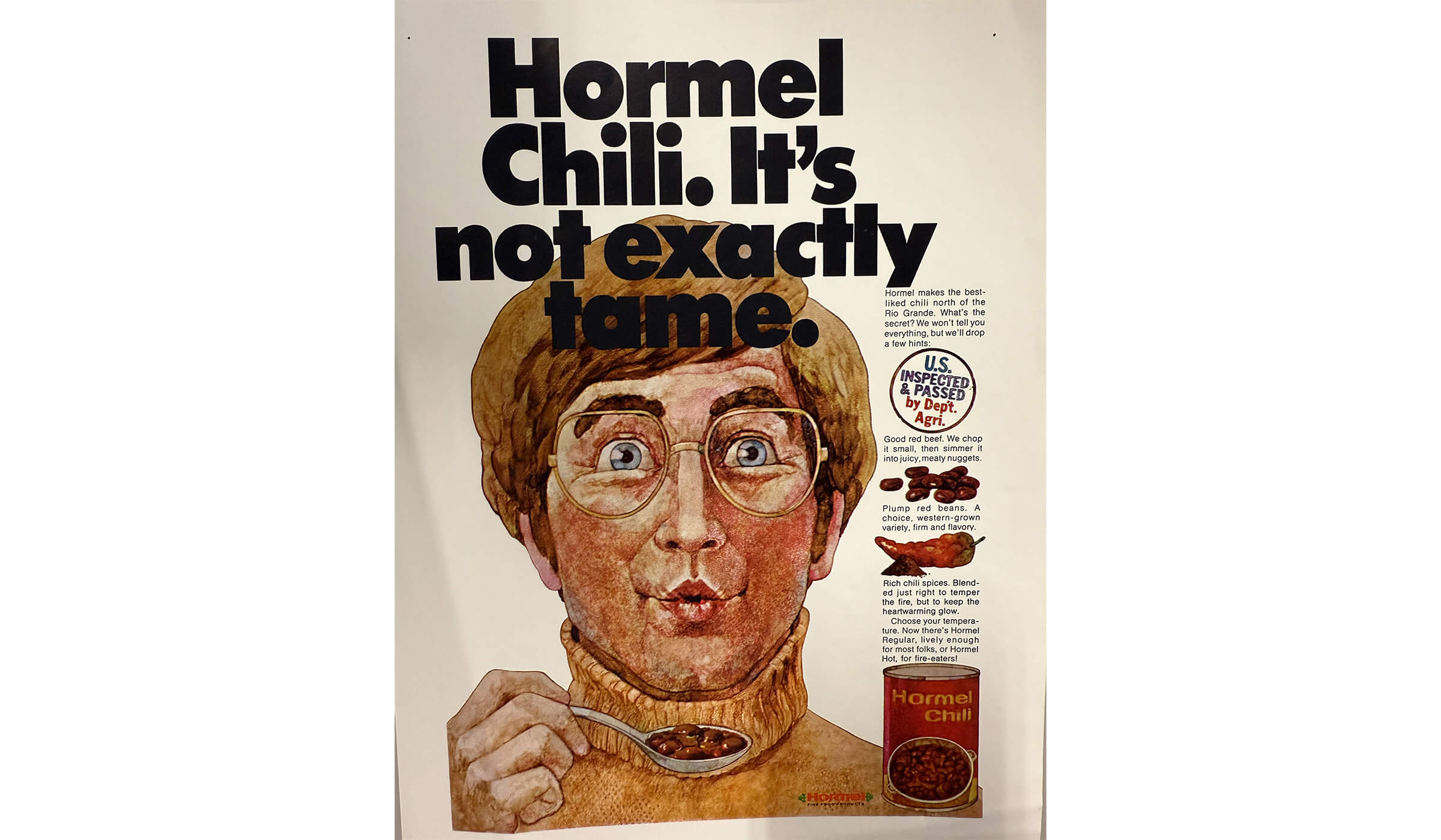 An ad in the late 1960’s featuring the new slogan “Hormel Chili. It’s not exactly tame”.