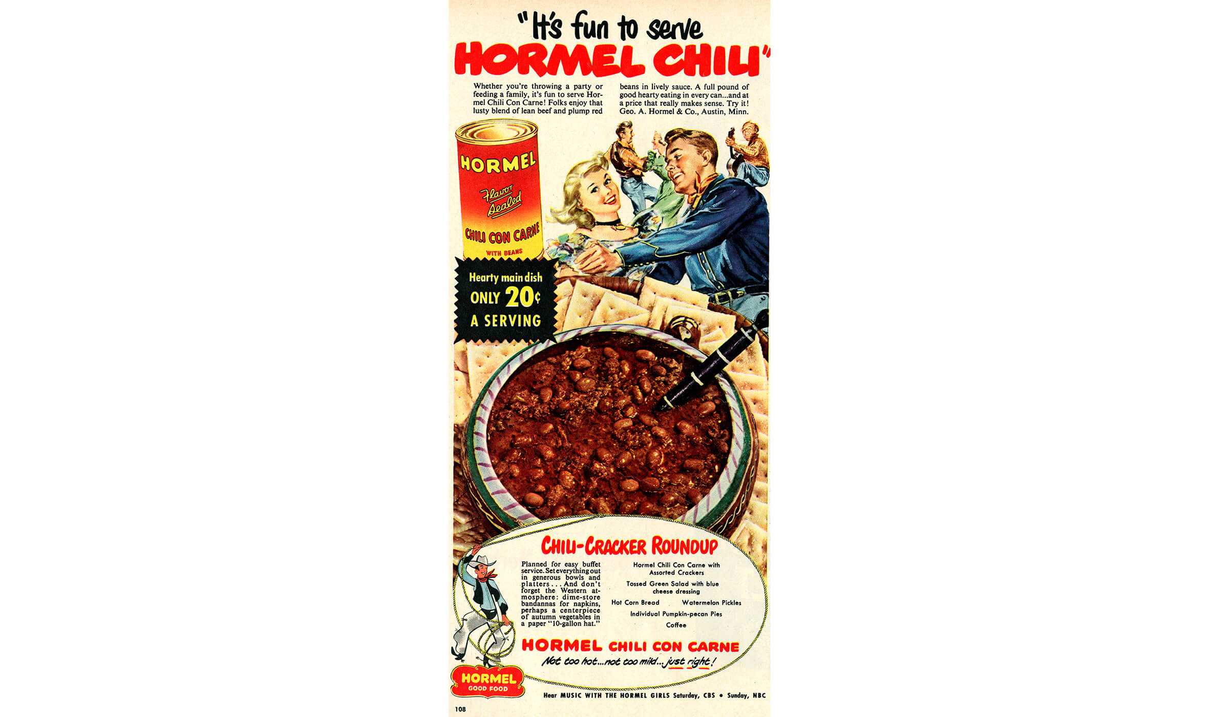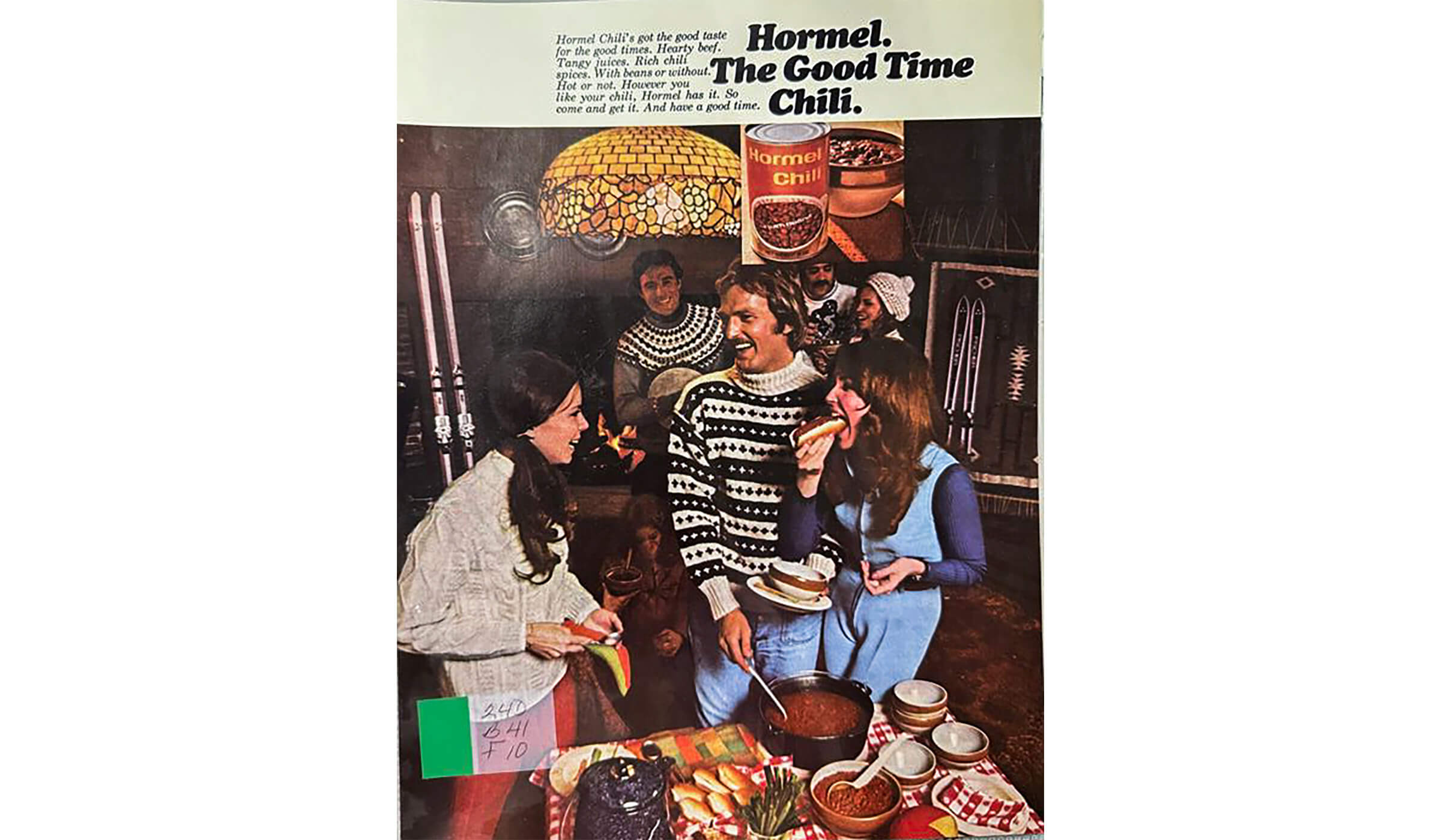An early 1970s ad with the slogan ‘Hormel, the Good Time Chili’ showcasing chili as the center of entertainment