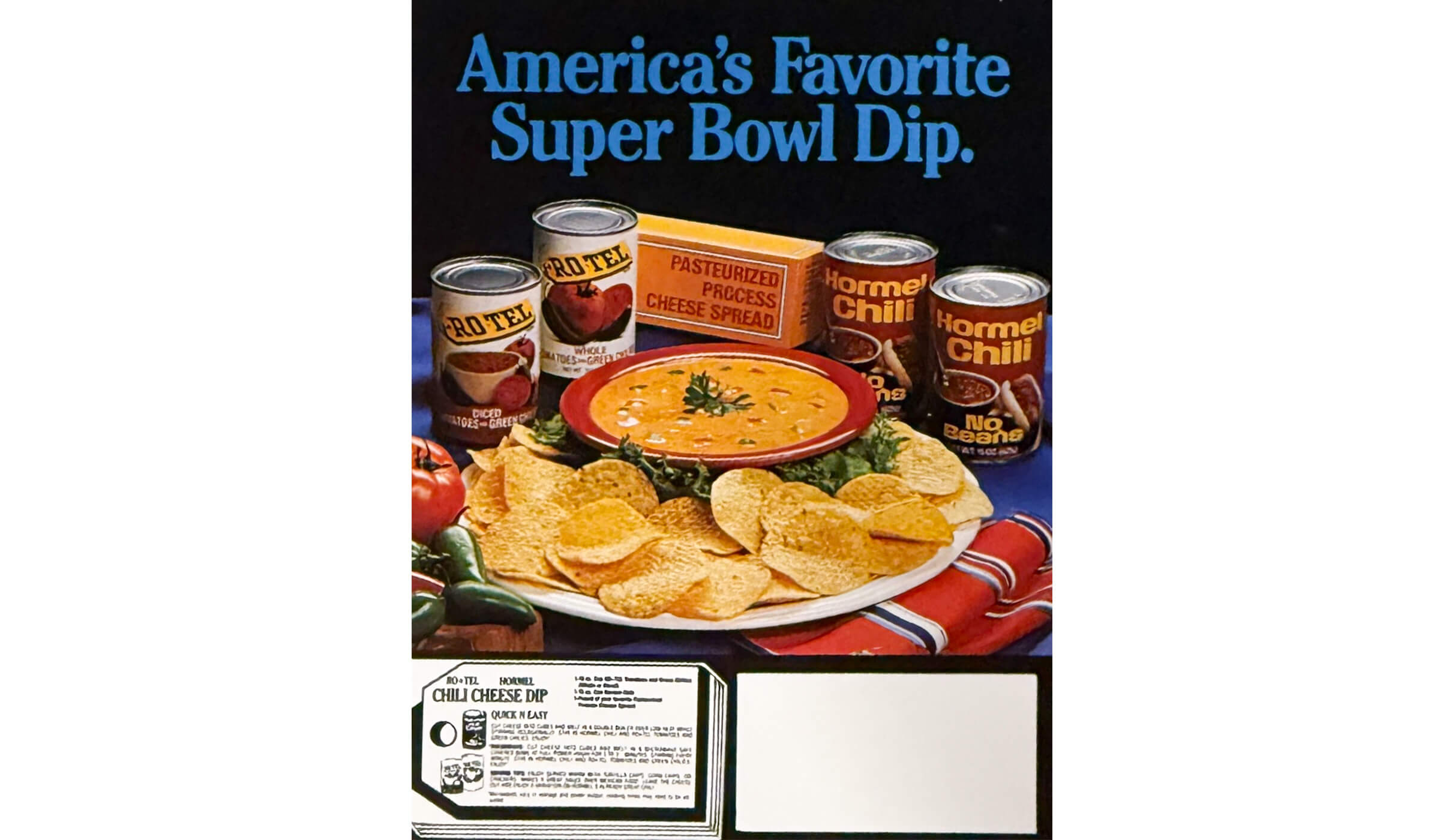 In the early 1950s, Hollywood stars like Ray Milland shared their favorite HORMEL® Chili recipes in magazine features as part of a new national ad campaign. The popular “Not too hot” slogan continued during this time, while a 1953 campaign proudly proclaimed “33% more beef than government standard.” By 1954, exciting new consumer-minded promotions ramped up in retail stores, including a point-of-sale college pennant giveaway aimed at sports fans and the fashionable “Snap-it Bracelet” promotion targeting housewives. That same year, a larger 19-ounce can of chili was introduced, followed shortly by a package redesign—streamlining the name to simply “HORMEL® Chili” by dropping the “Con Carne.” In the late 1950s, a new slogan was born: “It’s Chili time, delight dad with HORMEL® Chili,” signaling a shift toward men as the primary consumer. The decade also saw the birth of the soon-to-be legendary Chili Cheese Dip, first advertised with its recipe in 1958. At this time, HORMEL® Chili proudly positioned itself as “Real Chili.”
