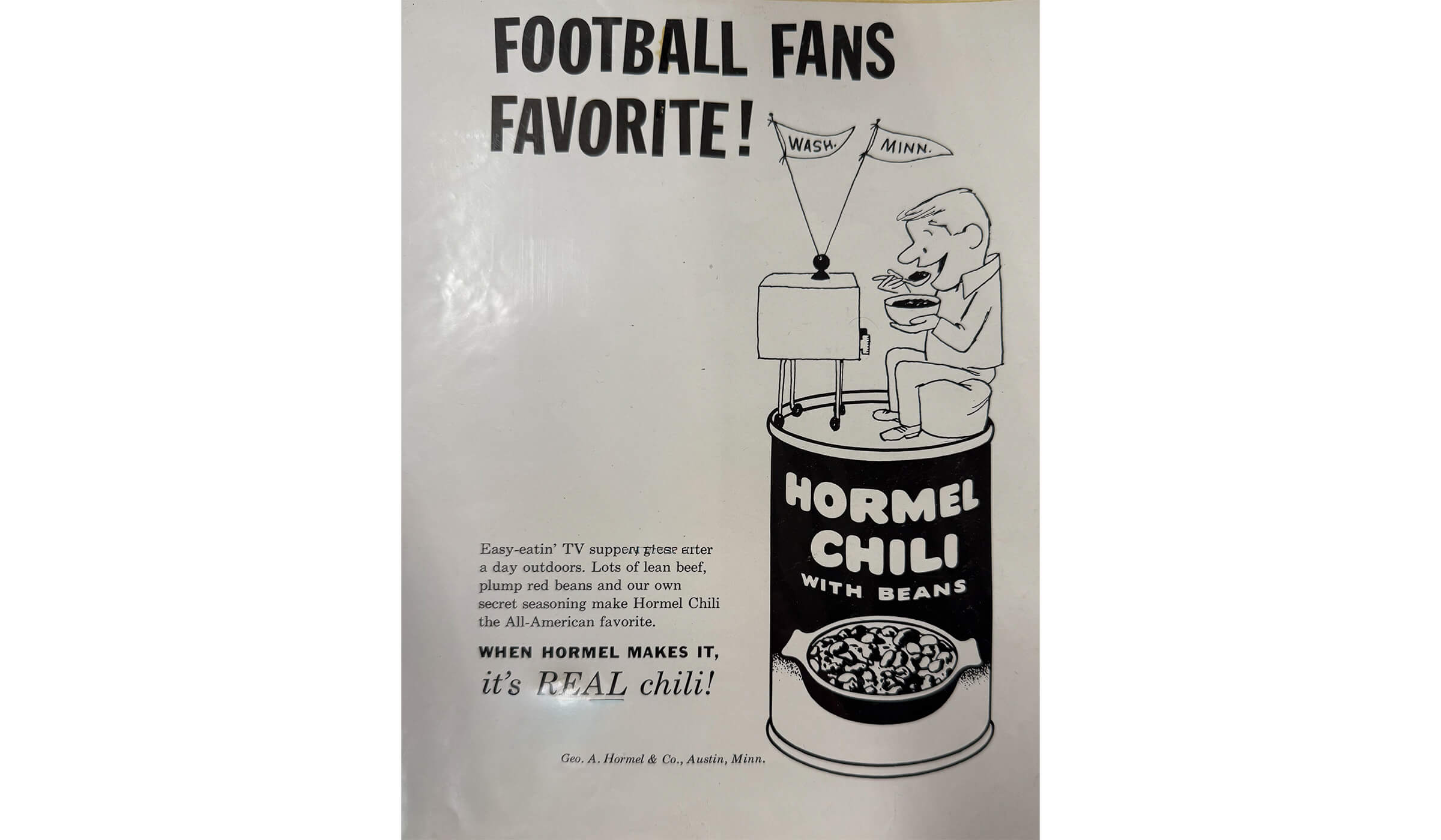 A mid 1960s ad showcasing chili as a ‘football fans favorite’, beginning the iconic pairing of football and chili.