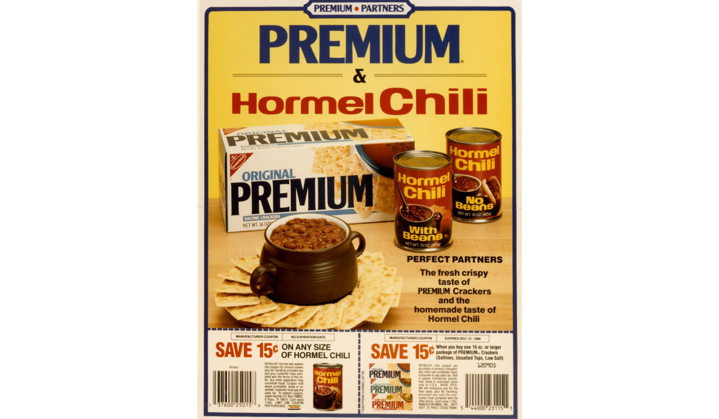 An early 1980s ad focusing on the convenience of an easy dinner- open and serve- with a partnership with Premium crackers