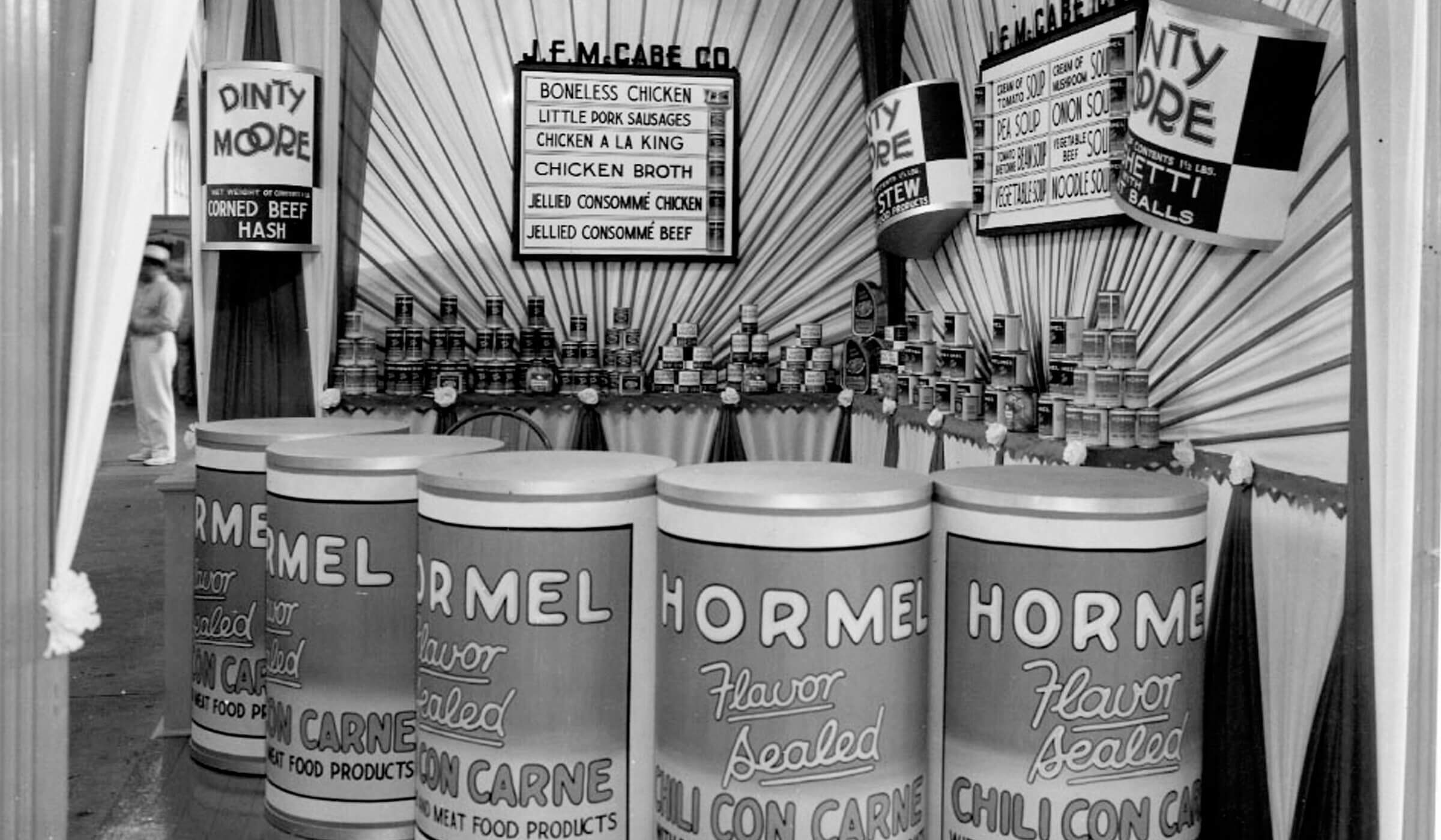 A display inside a supermarket advertising HORMEL® Chili Can Carne in the early 1930s