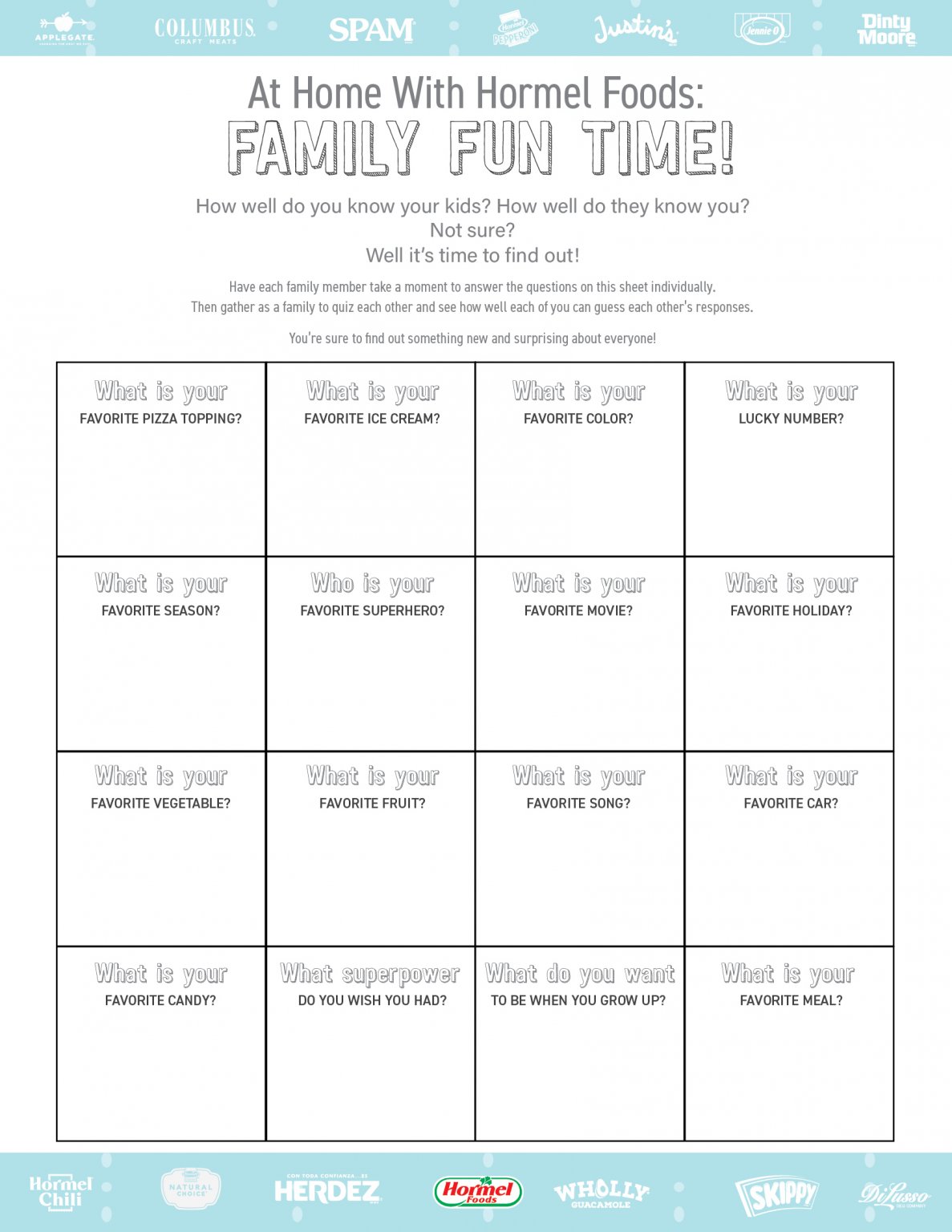 Discover how well you know your family with this family fun time activity sheet from Hormel Foods.