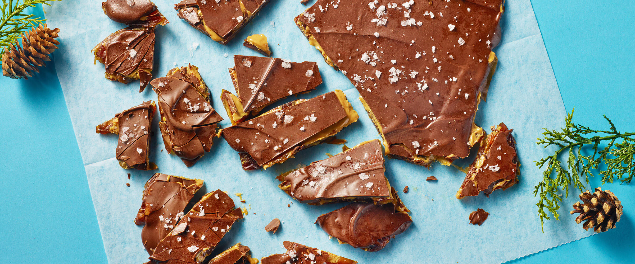 Spread melted chocolate chips over top of peanut butter. Sprinkle with flaky sea salt. Freeze 15 minutes. Chop or break into bite-sized pieces.
